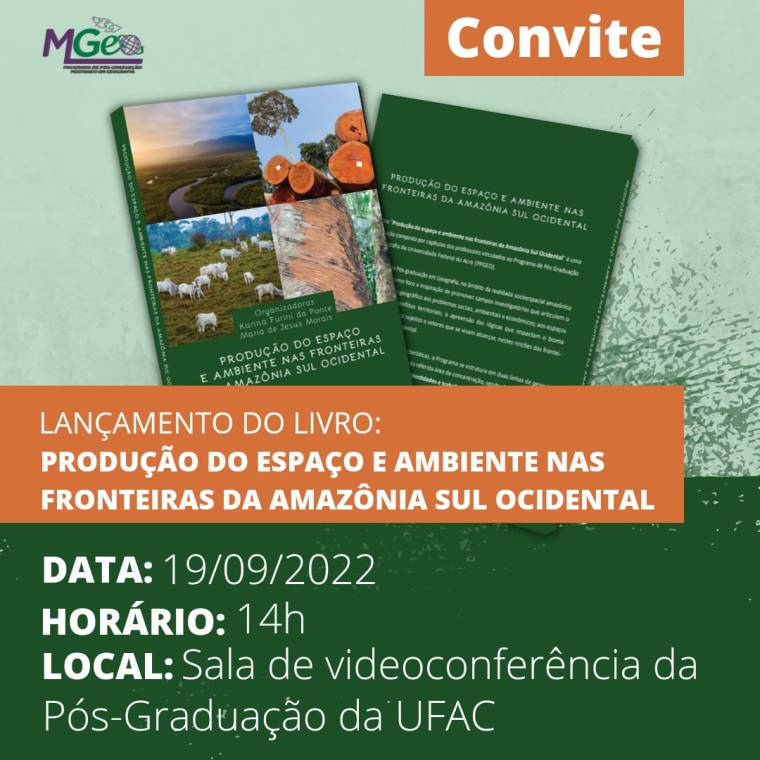 O Programa de Pós-Graduação em Geografia da Universidade Federal do Acre (PPGGEO/UFAC), lançará na segunda-feira, dia 19 de setembro de 2022, o livro intitulado: “PRODUÇÃO DO ESPAÇO E AMBIENTE NAS FRONTEIRAS DA AMAZÔNIA SUL OCIDENTAL”, que é composto por capítulos escritos pelos professores vinculados ao Programa de Pós-Graduação em Geografia da UFAC de modo a expressar as linhas teóricas e áreas de interesse de pesquisas desenvolvidas no âmbito do PPGGEO pelos docentes.