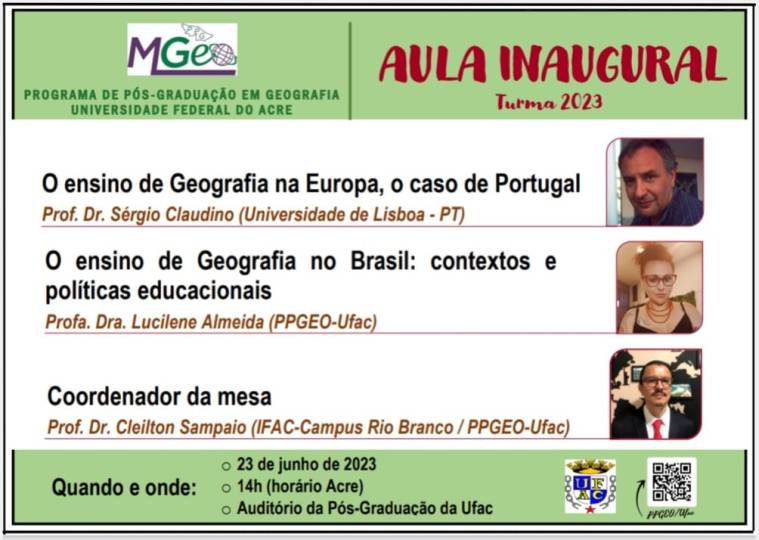 O Programa de Pós-Graduação em Geografia da Universidade Federal do Acre realizará na próxima sexta-feira, 23 de junho de 2023, a aula inaugural da turma 2023 com foco: o ensino de Geografia na Europa, o caso de Portugal com o Professor Doutor Sérgio Claudino (Universidade de Lisboa – PT) e o ensino de Geografia no Brasil: contextos e políticas educacionais com a Professora Doutora Lucilene Almeida (PPGEO – Ufac) com o Professor Doutor Cleilton Sampaio (IFAC – Campus Rio Branco/PPGEO – Ufac) na coordenação de mesa. O evento ocorrerá a partir das 14h (horário padrão do Acre) no Auditório da Pós-Graduação da Universidade Federal do Acre (Bloco dos Mestrados)