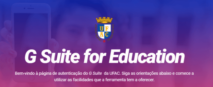 O G Suite for Education é um pacote de solução digitais desenvolvidas pela Google e que reúne diversas ferramentas de produtividade, comunicação e colaboração entre usuários. Criada especialmente para as atividades de ensino e aprendizagem, o G Suite for Education é disponibilizado gratuitamente às instituições de ensino e reúne soluções como o correio eletrônico GMail e o repositório de arquivos Drive, ambos com cota ilimitada de armazenamento; o Meet, webconferência para até 100 pessoas; o Classroom, sala de aula virtual colaborativa para atividades de ensino e aprendizagem; o Docs, para edição de textos, planilhas e apresentações web; o Forms , para elaboração, compartilhamento e coleta de formulários online; e o Agenda, que auxilia na organização de compromissos de forma sincronizada a todas as ferramentas já mencionadas. A UFAC passa a disponibilizar à comunidade acadêmica os serviços acima e disponibiliza esta página como centro de informações e orientação aos novos usuários. Sinta-se à vontade e aproveite os recursos que o G Suite tem a oferecer.